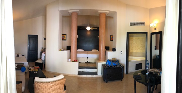 Deshalb gibts ein Paar Infos zum Hotel. Das Bavaro Princess in Punta Cana ist eine sehr weitläufige Hotelanlage mit ca. 90 zweistöckigen Häusern, mit je acht Wohneinheiten. Das Zimmer macht ordentlich Eindruck wenn man es betritt. Es ist wirklich sehr großzügig geschnitten und mit einem Doppelbett auf einer Empore und einem Whirlpool ausgestattet, den das Herzkind heute unbedingt testen wollte und natürlich auch durfte. Genauer in die Ecken schauen darf man allerdings nicht, da hier einfach der Bau- und Sauberkeitsstandard ein ganz anderer ist, als bei uns. Aber wir fühlen uns sehr wohl hier. Eine große Terrasse lädt zum Verweilen ein.