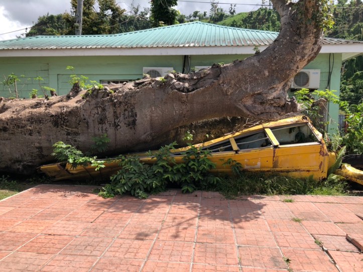 Leider wird Dominica recht häufig von Wirbelstürmen heimgesucht. Im September 2017 kam Hurrikan Maria mit solcher Wucht über die Insel, dass alles was grün war, einfach weggefegt wurde. Jeffrey erzählte uns von diesem traumatischen Ereignis. Er hatte es selbst miterlebt und ich konnte seine Schockstarre immer noch spüren. Er erzählte uns, dass er in einem Steinhaus war und es dauerte Stunden, nur unterbrochen von 20 min absoluter Stille (dem Auge des Hurrikans) in denen das Haus ganz fürchterlich laut brummte und vibrierte. Danach sah es aus: „wie nach einem Atomschlag“ Und jetzt nach einem halben Jahr kann man das Ausmaß der Zerstörung immer noch erahnen. Der Regenwald sieht aus, wie abrasiert, viele Palmen sind weggeknickt wie Streichhölzer und 40 Prozent der Einwohner haben immer noch keinen Strom. Denn die Bäume haben beim umfallen die Stromleitungen mit umgerissen.