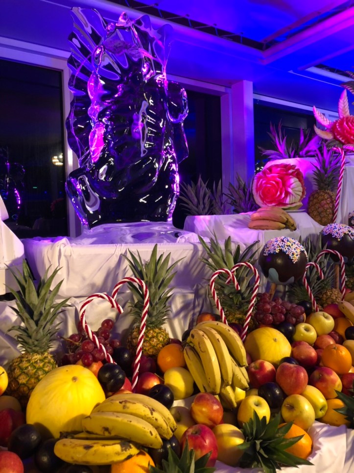 Am Abend ist Poolparty angesagt. Es gibt ein riesiges Obst-/Schokoladenbuffet. Und natürlich sind wir satt, aber so ein kleines bisschen Schokoladenobst am Stiel muss natürlich noch sein.
