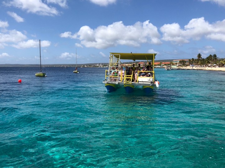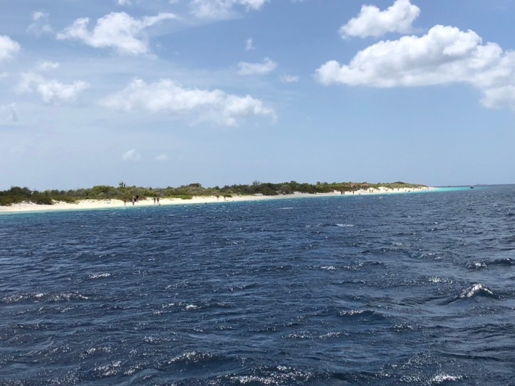 Auch hier finden wir ganz schnell den Stand an dem man die Tickets für die Überfahrt kaufen kann. Mit einem kleinen Katamaran fahren wir zuerst den Eden und Coco Beach an, wo Leute auf und absteigen, und dann gehts weiter zum No Name Beach nach Klein-Bonaire. Das ist eine komplett unbewohnte Insel ohne Infrastruktur. Es gibt keine Liegen, Sonnenschirme oder Restaurants. Aber, oder gerade deswegen, es ist unglaublich schön. Das Meer schimmert in allen möglichen blau und türkis Tönen und der Sand ist strahlend weiß.