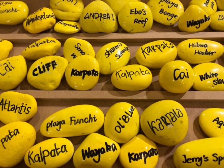 Bonaire ist ein Tauch- und Schnorchelparadies. Am Strand über der ganzen Insel verteilt, liegen große gelbe Steine, die die Einstiege für Tauchspots markieren. Die „Yellowstones“ gibt es sogar als Souvenir zu kaufen.