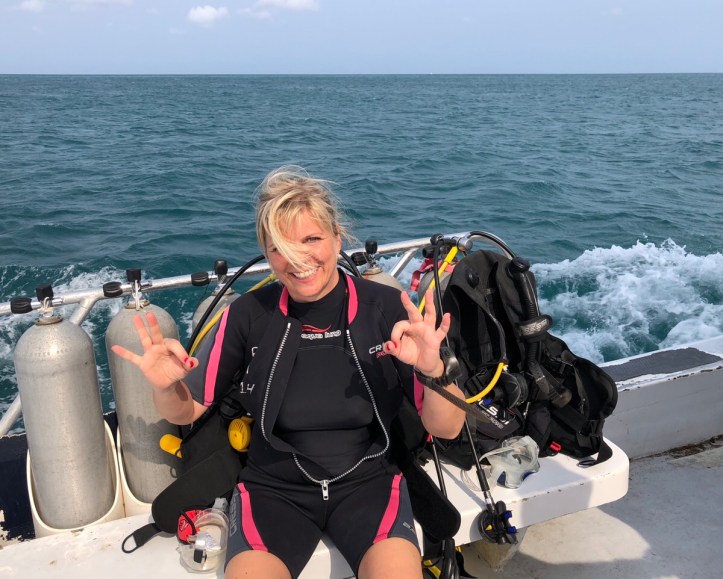 Als die Brücke des Schiffes im Nebel des Wassers auftaucht, wird man schon daran erinnert, dass es sich hier um ein Schiff handelt. Insgesamt ist es ein total entspannter Tauchgang. Nach einer kurzen Oberflächenpause fahren wir zu einem zweiten Tauchspot, an dem, sagen wir mal, ein wenig Schrott rum liegt. Das hört sich erst mal negativ an, aber daraus entstehen ja wunderschöne Korallenbänke. Wie auch hier. Wir entdecken u. a. eine kleine Wasserschlange, Muränen, Oktopus, Papageienfische und es gibt einige Fischschwärme, durch die hindurch zu schwimmen ein großartiges Erlebnis ist.