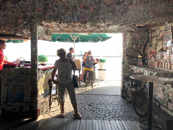 Beim Bummeln an der Strandpromenade kommen wir an einer kleinen Bar „The Poddock“ vorbei, in der jeder, der möchte, einen Dollar-Schein unterschreibt und an die Wand heftet. Das nenne ich mal gutes Money-Feng Shui.