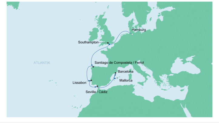 Hamburg – Southhampton – Ferrol – Lissabon – Cadiz – Barcelona – Mallorca