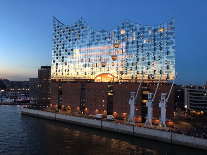 Das erste Ablegen auf einem Kreuzfahrtschiff ist immer etwas ganz besonderes… aber diese Ausfahrt auf der Elbe hat einfach alles übertroffen. Es gibt keine Worte, die diese Emotionen annähernd wiedergeben. Bei 25 Grad Außentemperatur stehen wir an der Reling und winken wildfremden Menschen an Land zu, die wiederum uns von unten zuwinken. Die Sonne geht gerade unter und taucht die Elbphilharmonie in ein fantastisches Licht, an der wir langsam vorbei fahren. Auch hier stehen die Menschen auf der Aussichtsplattform und den Balkonen und halten den Moment wiederum von ihrer Seite mit ihren Handys fest.