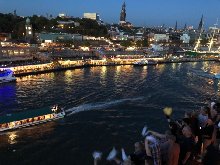 Später erzählt unsere Kapitänin, dass diese Ausfahrt auch für Sie absolut einzigartig war und der Lotse aus dem Hamburger Hafen sie dazu ermutigte, das Horn ruhig öfter zu betätigen, als üblich, denn die Hamburger würden es lieben … wir übrigens auch. Dann ging es weiter an den Landungsbrücken vorbei, die Dank des warmen Wetters proppevoll mit Besuchern sind. Und auch hier ist die Stimmung auf beiden Seiten ausgelassen. Ich kann mich gar nicht beruhigen darüber zu berichten… merkt man, oder 🙂