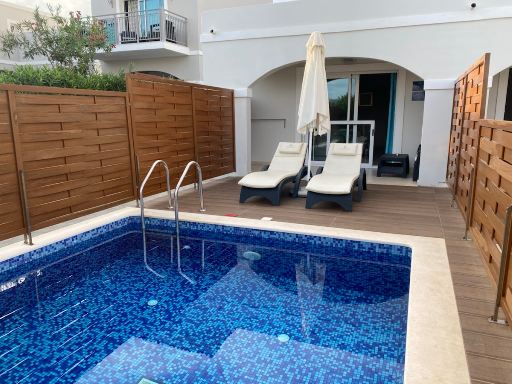 Zum Glück haben wir ein Auto gebucht und können sofort weiter. Denn die Schlange am FTI Schalter ist bestimmt 50m lang, da drei Flugzeuge gleichzeitig gelandet sind. Bis alle im Bus verstaut sind, dauert es bestimmt noch eine Stunde. Aber wie gesagt, wir fahren mit unserem Mietwagen noch 1 1/2 Stunden durch die Nacht. Dank Google Maps finden wir unser HotelAnemos Luxury Gran Hotel gut und wir werden super freundlich mit einem Begrüßungsgetränk empfangen. Wir werden mit einem Caddywagen auf unsere hübsche Unterkunft gebracht und stellen fest, dass wir ein kostenloses Upgrade für ein Zimmer mit Privatpool bekommen haben. Nach den Anlaufschwierigkeiten ist das wirklich eine tolle Überraschung. Todmüde fallen wir in unsere weißen Betten, die herrlich bequem sind und sind in Nullkomma nix eingeschlafen.