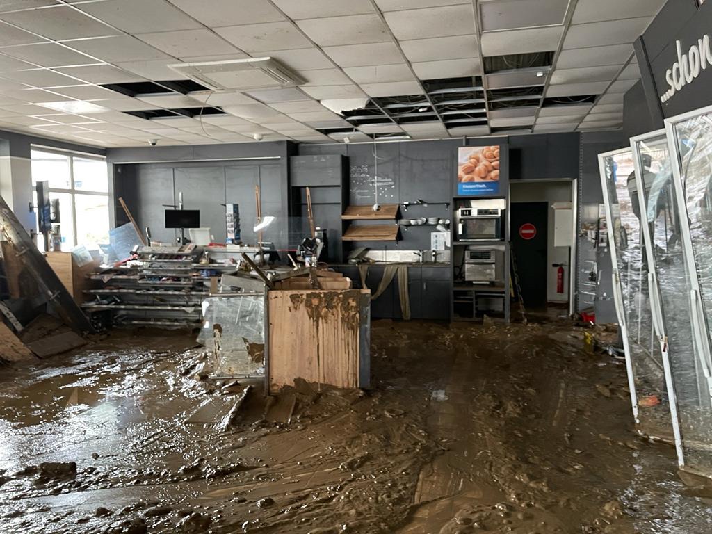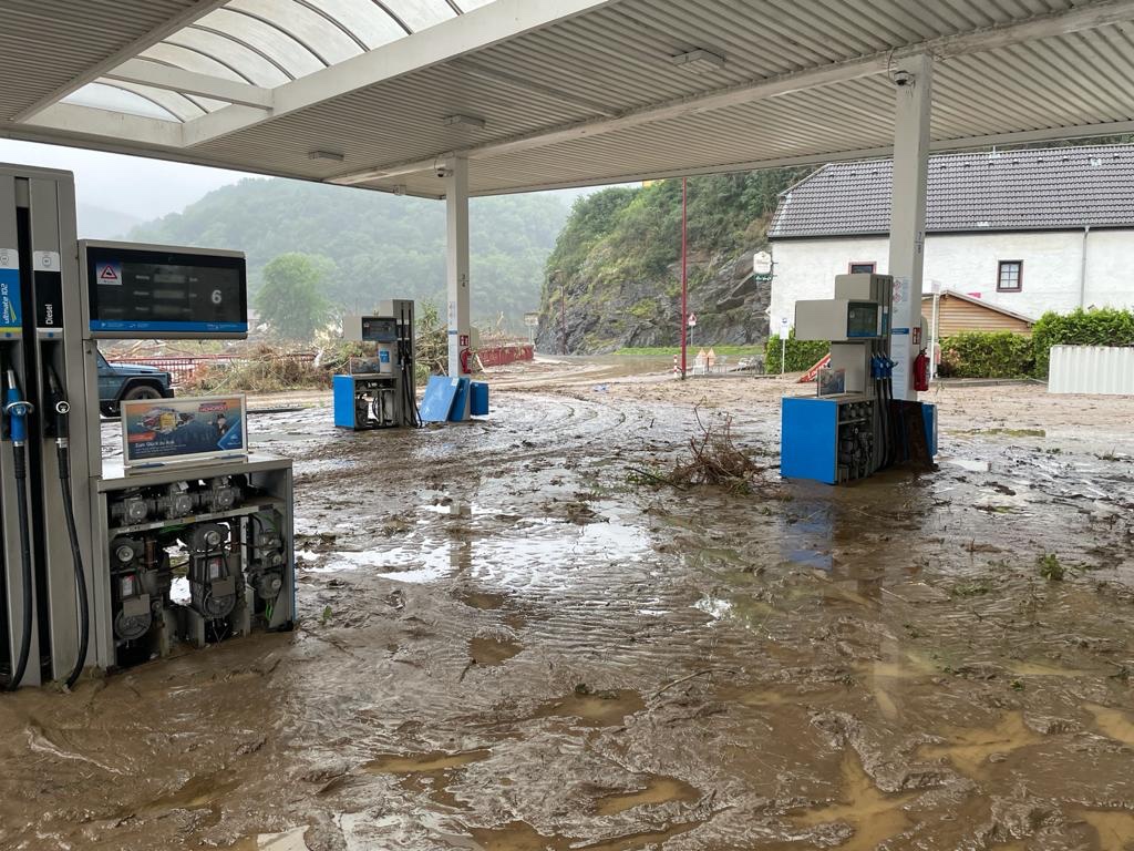 Da die Straße nach Ahrbrück teilweise weggespült war, konnten wir erst am nächsten Tag über die Autobahn mit einem großen Umweg dorthin. Ganz Ahrbrück war mit Schlammassen, abgebrochenen Bäumen und alles was von der Ahr mitgerissen wurde bedeckt. In unserer Tankstelle stand in der Unglücksnacht das Wasser 3,5 Meter hoch. Dementsprechend lag die komplette Ladeneinrichtung und was sich darin befand nun kreuz und quer.